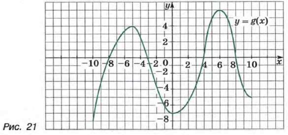 37. На рисунке 21 изображен график функции у = g(x), где — -10 ≤ х ≤ 10. Сколько нулей имеет функция? Укажите: а) промежутки, в которых функция принимает отрицательные значения; б) промежутки, в которых функция убывает.
