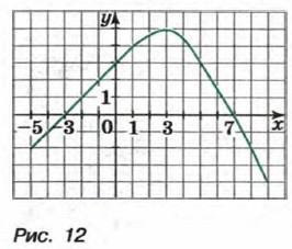 Рассмотрим теперь свойства функции у = ƒ(x), где -5 ≤ х ≤ 9, график которой изображен на рисунке 12. Выясним сначала, при каких значениях х функция обращается в нуль, принимает положительные и отрицательные значения. Найдем абсциссы точек пересечения графика с осью х. Получим х = — 3 и х = 7. Значит, функция принимает значение, равное нулю, при х = — 3 и х — 7. Значения аргумента, при которых функция обращается в нуль, называют нулями функции, т. е. числа -3 и 7 — нули рассматриваемой функции. Нули функции разбивают ее область определения — промежуток [-5; 9] на три промежутка: [-5; -3), (-3; 7) и (7; 9]. Для значений х из промежутка (-3; 7) точки графика расположены выше оси х, а для значений х из промежутков [-5; -3) и (7; 9] — ниже оси х. Значит, в промежутке (—3; 7) функция принимает положительные значения, а в каждом из промежутков [-5; -3) и (7; 9] — отрицательные. Промежутки, в которых функция сохраняет знак, называют промежутками знакопостоянства. Выясним теперь, как изменяются (увеличиваются или уменьшаются) значения данной функции с изменением х от -5 до 9. Из графика видно, что с возрастанием х от -5 до 3 значения у увеличиваются, а с возрастанием х от 3 до 9 значения у уменьшаются. Говорят, что в промежутке [-5; 3] функция у = ƒ(x) является возрастающей, а в промежутке [3; 9] эта функция является убывающей.