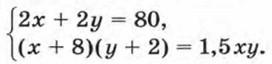 2х + 2у = 80. Площадь прямоугольника равна ху см2. После увеличения сторон основание прямоугольника будет равно (х + 8) см, высота будет равна (у + 2) см, а площадь будет равна (х + 8)(у + 2) см2. По условию задачи площадь прямоугольника увеличится в полтора раза, т. е. (х + 8) (у + 2) = 1,5xy. Итак, имеем систему уравнений