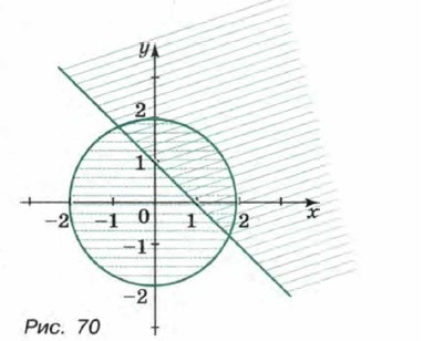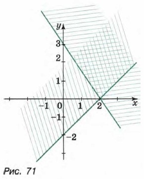является сегмент, показанный на рисунке 70 двойной штриховкой. Остановимся подробнее на примерах систем, состоящих из двух линейных неравенств. Пример 2. Изобразим на координатной плоскости множество решений системы