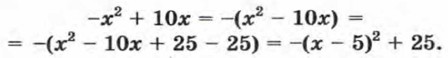 § 2. Квадратный трехчлен Квадратный трехчлен и его корни (продолжение)Пример 3. Докажем, что из всех прямоугольников с периметром 20 см наибольшую площадь имеет квадрат. Пусть одна сторона прямоугольника равна х см. Тогда другая сторона равна 10-х см, а площадь прямоугольника равна х(10 - х) см2. Раскрыв скобки в выражении х(10 - х), получим 10х - х2. Выражение -х2 + 10х представляет собой квадратный трехчлен, в котором а = — 1, b = 10, с = 0. Выделим квадрат двучлена: