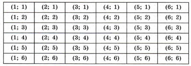 В каждой паре на первом месте записано число очков, выпавших на белом кубике, а на втором месте — число очков, выпавших на черном кубике. Указанные исходы испытания равновозможны. Общее число равновозможных исходов равно 36. Пусть событие А означает, что при бросании кубиков в сумме выпало 8 очков, а событие В означает, что в сумме выпало 7 очков. Для события А благоприятными являются 5 исходов: (2; 6), (3; 5), (4; 4), (5; 3), (6; 2). Для события В благоприятными являются б исходов: (1; 6), (2; 5), (3; 4), (4; 3), (5; 2), (6; 1). Отсюда