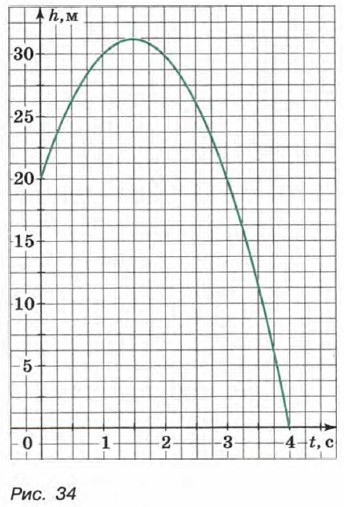 На рисунке 34 показан график зависимости h от t для случая, когда h0 = 20, υ0 = 15. Найдите по графику: а) сколько времени тело поднималось вверх;