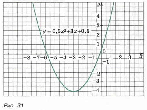 Построив точки, координаты которых указаны в таблице, и соединив их плавной линией, получим график функции у = 0,5x2 + 3х + 0,5 (рис. 31).