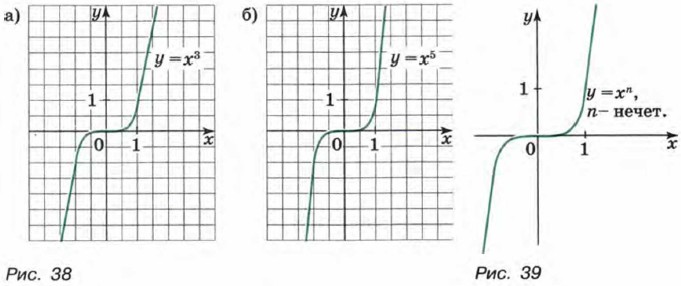 На рисунке 38 изображены графики функций у = х3 и у = х5. На рисунке 39 показано, как выглядит график функции у = хn с нечетным показателем n > 1. Упражнения136. Функция задана формулой у = х36. Сравните с нулем значение этой функции при х = -5; 0; 3. 137. Сравните с нулем значение функции у = х49 при х = -9; 0; 7. 138. Функция задана формулой ƒ(х) = х20. Сравните: