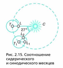 Практические основы астрономии Движение и фазы ЛуныПолный цикл смены лунных фаз составляет 29,5 суток. Этот промежуток времени между двумя последовательными одинаковыми фазами называется синодическим месяцем (от греч. synodos — соединение). Ещё в глубокой древности у многих народов месяц, наряду с сутками и годом, стал одной из основных календарных единиц. Понять, почему синодический месяц длиннее сидерического, нетрудно, если вспомнить, что Земля движется вокруг Солнца. На рисунке 2.15 взаимное расположение Земли Т и Луны L соответствует новолунию. Через 27,3 суток Луна займет на небе прежнее положение относительно звезд и будет находиться в точке L1. За это время Земля, на 1° в сутки, пройдёт по орбите дугу в 27° и окажется в точке Т1. Луне, для того чтобы снова оказаться в новолунии L2, придётся пройти по орбите такую же дугу (27°). На это потребуется немногим более двух суток, поскольку за сутки Луна смещается на 13°.