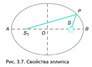 Строение Солнечной системы Законы движения планет Солнечной системыКак известно, эллипсом называется кривая, у которой сумма расстоянии от любой точки Р до его фокусов есть величина постоянная. На рисунках 3.6 и 3.7 обозначены: О — центр эллипса; S и S1 — фокусы эллипса; АВ — его большая ось. Половина этой величины (а), которую обычно называют большой полуосью, характеризует размер орбиты планеты. Ближайшая к Солнцу точка А называется перигелий, а наиболее удалённая от него точка В — афелий. Отличие эллипса от окружности характеризуется величиной его эксцентриситета: е = OS/OA. В том случае, когда эксцентриситет равен 0, фокусы и центр сливаются в одну точку — эллипс превращается в окружность.