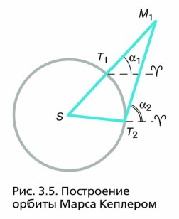 В своих поисках Кеплер исходил из убеждения, что «в мире правит число», высказанного ещё Пифагором. Он искал соотношения между различными величинами, характеризующими движение планет, — размеры орбит, период обращения, скорость. Кеплер действовал фактически вслепую, чисто эмпирически. Он пытался сопоставить характеристики движения планет с закономерностями музыкальной гаммы, длиной сторон описанных и вписанных в орбиты планет многоугольников и т. д. Кеплеру необходимо было построить орбиты планет, перейти от экваториальной системы координат, указывающих положение планеты на небесной сфере, к системе координат, указывающих её положение в плоскости орбиты. Он воспользовался при этом собственными наблюдениями планеты Марс, а также многолетними определениями координат и конфигураций этой планеты, проведёнными его учителем Тихо Браге. Орбиту Земли Кеплер считал (в первом приближении) окружностью, что не противоречило наблюдениям. Чтобы построить орбиту Марса, он применил способ, который показан на рисунке 3.5.