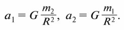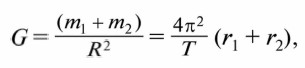 § 14. Движение небесных тел под действием сил тяготения Масса и плотность ЗемлиБолее точная формула третьего закона Кеплера, которая была получена Ньютоном, даёт возможность определить одну из важнейших характеристик любого небесного тела — массу. Выведем эту формулу, считая (в первом приближении) орбиты планет круговыми. Пусть два тела, имеющие массы m1, и m2, взаимно притягивающиеся и обращающиеся вокруг общего центра масс, находятся от центра масс на расстоянии r1 и r2 и обращаются вокруг него с периодом Т. Расстояние между их центрами R = r1 + r2. На основании закона всемирного тяготения ускорение каждого из этих тел равно: