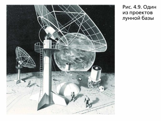 Американские корабли «Аполлон» и советские автоматические станции доставили на Землю около 400 кг образцов лунных пород, которые были подвергнуты детальному химическому анализу в лабораторных условиях на Земле. Породы Луны похожи на земные изверженные породы, но обеднены по сравнению с ними летучими элементами, железом и водой. Набор минералов в их составе оказался беднее (около 50), чем в земных породах, где содержится более 2000 минералов. В лунных породах преобладают силикаты и оксиды, встречаются также фосфаты, сульфиды, карбиды и фосфиды. На Луне практически нет минералов, отличающихся от земных, но в то же время отсутствуют те из них, которые могут образовываться в водной среде и при наличии свободного кислорода. Никаких признаков жизни даже в виде микроорганизмов или органических соединений на Луне не обнаружено. Доставленные на поверхность Луны сейсмометры позволили зарегистрировать большое число лунотрясений — до 3000 за год. Однако все они очень слабы — их сейсмическая энергия в миллиард раз меньше, чем на Земле. Так же как и на Земле, регистрация сейсмических колебаний позволила уточнить внутреннее строение Луны. Оказалось, что лунная кора значительно толще земной: от 60 км на видимом с Земли полушарии до 100 км на обратной стороне. Структура верхних слоев коры исследовалась посредством активных сейсмических экспериментов при падениях на Луну отработанных частей кораблей «Аполлон» и искусственных взрывах на поверхности Луны. Под реголитом лежит слой пород, выброшенных при образовании крупных кратеров. Его толщина меняется от нескольких десятков до сотен метров. Ещё ниже до глубины примерно 1 км располагаются растрескавшиеся от многочисленных ударов базальтовые породы. Определённый различными методами возраст пород, доставленных с Луны, как говорилось ранее, близок к возрасту Земли, что свидетельствует об их совместном происхождении. В то же время на лунной поверхности не было обнаружено более молодых пород, что говорит о давнем прекращении лавовых излияний и вулканической активности. Отсутствие на Луне процессов размывания и выветривания позволяет считать её своеобразным геологическим заповедником, где на протяжении миллионов и миллиардов лет сохраняются все возникавшие за это время формы рельефа. Таким образом, изучение Луны даёт возможность понять геологические процессы, происходившие на Земле в далёком прошлом, от которого на нашей планете не осталось никаких следов. В настоящее время существуют детально разработанные проекты создания на Луне крупной обитаемой базы (рис. 4.9), где смогут длительное время находиться участники экспедиций. Наличие такой базы позволит постоянно проводить наблюдения за нашей планетой, объектами ближнего и дальнего космоса, а также другие исследования, которые трудно осуществить на Земле или на орбитальных станциях. Так, например, обратная сторона Луны удобна для размещения радиотелескопов, поскольку тем самым практически исключаются помехи наземных радиотехнических средств. При реализации этих проектов предполагается максимально использовать ресурсы самой Луны.