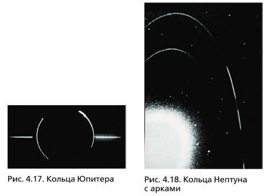§ 19. Далёкие планеты Спутники и кольца планет-гигантовТитан оказался вторым после Земли небесным телом, на поверхности которого обнаружены крупные стабильные резервуары жидкости — озёра и моря. Внешне они напоминают водоёмы на земном шаре, хотя и заполнены жидким метаном. Чрезвычайно низкая температура полностью исключает возможность существования жидкой воды на поверхности Титана. Вместе с тем происходящий на спутнике Сатурна круговорот метана аналогичен круговороту воды на Земле. Из недр газообразный метан попадает в атмосферу при вулканических и тектонических процессах. Затем он частично превращается в другие углеводородные соединения под воздействием солнечных лучей, а частично конденсируется в облака, из которых капельки жидкого метана выпадают мелким дождём на поверхность. Стекая в низкие регионы, метан образует озёра и моря. С поверхности этих резервуаров он вновь испаряется, поступая в атмосферу и участвуя в дальнейшем круговороте. Исследования, проведённые с помощью космических аппаратов, показали, что, кроме множества спутников, все планеты-гиганты имеют ещё и кольца. С момента своего открытия в XVII в. кольца Сатурна (см. рис. 2, 3 на цветной вклейке VII) долгое время считались уникальным образованием в Солнечной системе, хотя некоторые учёные высказывали предположения о наличии колец у Юпитера и других планет-гигантов. Уже в XIX в. в работах Джеймса Максвелла и Аристарха Аполлоновича Белопольского было доказано, что кольца не могут быть сплошными. «Исчезновения» колец Сатурна, которые случались примерно через 15 лет, когда Земля оказывалась в плоскости этих колец, можно было объяснить тем, что толщина колец мала. Постепенно стало очевидно, что кольца Сатурна представляют собой скопления небольших по размеру тел, крупных и мелких кусков, которые обращаются вокруг планеты по почти круговым орбитам. Все они так малы, что по отдельности не видны. Благодаря большому количеству частиц кольца кажутся сплошными, хотя сквозь кольца Сатурна, например, просвечивает и поверхность планеты, и звёзды (см. рис. 3 на цветной вклейке X). Даже эти наиболее заметные кольца при общей ширине порядка 60 тыс. км имеют толщину не более 1 км. Снимки, сделанные с КА «Вояджер», показывают их сложное строение. Кольца всех остальных планет-гигантов, включая Юпитер (рис. 4.17), значительно уступают по размерам и яркости кольцам Сатурна. На снимках заметно, что в кольцах Нептуна вещество распределено неравномерно и образует отдельные сгущения — арки (рис. 4.18).