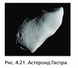 § 20. Малые тела Солнечной системы. Карликовые планеты АстероидыСовременные наблюдательные средства, в частности приборы, установленные на космических аппаратах, обнаружили, что в окрестностях Земли каждый месяц пролетает несколько тел размером от 5 до 50 м. К настоящему времени известно более 6000 объектов, периодически сближающихся с Землёй. Из них около 900 имеют размеры более 1 км, в том числе свыше 100 таких объектов считаются потенциально опасными для нашей планеты. Опасения по поводу возможного столкновения таких тел с Землей значительно усилились после падения на Юпитер кометы Шумейкеров—Леви 9 в июле 1995 г. Это стимулировало поиски и отслеживание комет и астероидов, которые пересекают орбиту Земли, а также разработку способов, которые позволят избежать столкновения (вплоть до уничтожения этих тел). Нет особых основании считать, что количество столкновении с Землей может сколько-нибудь заметно увеличиться в будущем (ведь «запасы» метеоритного вещества в межпланетном пространстве постепенно истощаются). Из числа столкновений, имевших катастрофические последствия, можно назвать лишь падение в 1908 г. Тунгусского метеорита — объекта, который, по современным представлениям, был ядром небольшой кометы. С помощью космических аппаратов впервые удалось с расстояния в несколько десятков тысяч километров получить изображения малых планет. Как и предполагалось, породы, составляющие их поверхность, оказались аналогичны тем, которые распространены на Земле и Луне. Подтвердились представления о том, что небольшие астероиды имеют неправильную форму, а их поверхность испещрена кратерами. Так, размеры Гаспры 19 х 12 х 11 км (рис. 4.21). У астероида Ида (размеры 56 х 28 х 28 км) обнаружен спутник (Дактиль) размером около 1,5 км, который, находясь от его центра на расстоянии около 85 км, обращается с периодом примерно 24 ч (см. рис. 2 на цветной вклейке XIII). В подобной «двойственности» заподозрено около 50 астероидов.