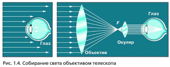 § 2. Наблюдения — основа астрономии 2. ТелескопыОсновным прибором, который используется в астрономии для наблюдения небесных тел, приёма и анализа приходящего от них излучения, является телескоп. Слово это происходит от двух греческих слов: tele — далеко и skopéo — смотрю. Телескоп применяют, во-первых, для того, чтобы собрать как можно больше света, идущего от исследуемого объекта, а во-вторых, чтобы обеспечить возможность изучать его мелкие детали, недоступные невооружённому глазу. Чем более слабые объекты даёт возможность увидеть телескоп, тем больше его проницающая сила. Возможность различать мелкие детали характеризует разрешающую способность телескопа. Обе эти характеристики телескопа зависят от диаметра его объектива. Количество света, собираемого объективом, возрастает пропорционально его площади (квадрату диаметра) (рис. 1.4). Диаметр зрачка человеческого глаза даже в полной темноте не превышает 8 мм. Объектив телескопа может превышать по диаметру зрачок глаза в десятки и сотни раз. С помощью телескопов и современных приёмников излучения возможно обнаружить звёзды и другие объекты, которые в 100 млн раз слабее объектов, видимых невооружённым глазом.