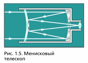 где λ — длина световой волны, a D — диаметр объектива телескопа, 206 265 — число секунд в радиане. У школьного телескопа, диаметр объектива которого составляет 60 мм, теоретическая разрешающая способность будет равна примерно 2". Напомним, что это превышает разрешающую способность невооружённого глаза (в среднем) в 60 раз. Реальная разрешающая способность телескопа будет меньше, поскольку на качество изображения существенно влияет состояние атмосферы, движение воздуха. Если в качестве объектива телескопа используется линза, то такой телескоп называется рефрактором (от лат. refracto — преломляю), а если вогнутое зеркало, — то рефлектор (reflecto — отражаю). Помимо рефракторов и рефлекторов в настоящее время используются различные типы зеркально-линзовых телескопов, один из которых — менисковый — представлен на рисунке 1.5.