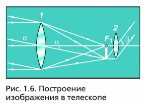 У небольших телескопов объективом, как правило, служит двояковыпуклая собирающая линза. Как известно, если предмет находится дальше двойного фокусного расстояния, она даёт его уменьшенное, перевёрнутое и действительное изображение. Это изображение располагается между точками фокуса и двойного фокуса линзы. Расстояния до Луны, планет, а тем более звёзд так велики, что лучи, приходящие от них, можно считать параллельными. Следовательно, изображение объекта будет располагаться в фокальной плоскости. Построим изображение Луны, которое даёт объектив 1 с фокусным расстоянием F (рис. 1.6). Объектив строит изображение объекта, линейные размеры которого определяются фокусным расстоянием F и угловыми размерами а объекта на небе. Воспользуемся теперь ещё одной линзой — окуляром 2, поместив её от изображения Луны (точка F1) на расстоянии, равном фокусному расстоянию этой линзы — ƒ. Фокусное расстояние окуляра должно быть меньше, чем фокусное расстояние объектива. Построив изображение, которое даёт окуляр, мы убедимся, что он увеличивает угловые размеры Луны: угол β заметно больше угла α.