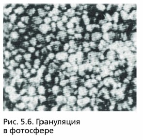 § 21. Солнце — ближайшая звезда Атмосфера СолнцаФотосфера — самый нижний слой атмосферы Солнца, в котором температура довольно быстро убывает от 8000 до 4000 К. Следствием конвективного движения вещества в верхних слоях Солнца является своеобразный вид фотосферы — грануляция (рис. 5.6). Фотосфера как бы состоит из отдельных зёрен — гранул, размеры которых составляют в среднем несколько сотен (до 1000) километров. Гранула — это поток горячего газа, поднимающийся вверх. В тёмных промежутках между гранулами находится более холодный газ, опускающийся вниз. Каждая гранула существует всего 5—10 мин, затем на её месте появляется новая, которая отличается от прежней по форме и размерам. Общая наблюдаемая картина при этом не меняется. Вещество фотосферы нагревается за счёт энергии, поступающей из недр Солнца, а излучение, которое уходит в межпланетное пространство, уносит энергию, поэтому наружные слои фотосферы охлаждаются.