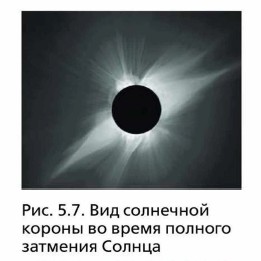 Температура короны резко возрастает по сравнению с температурой хромосферы и достигает 2 млн К. Причиной нагрева солнечной короны являются магнитозвуковые волны, поднимающиеся в корону из более глубинных слоёв Солнца. Для короны, которую можно наблюдать во время полных солнечных затмений как жемчужно-серебристое сияние, характерна лучистая структура с множеством сложных деталей — дуг, шлемов и т. д. (см. рис. 5.7). Солнечная корона (рис. 5.8) явилась для астрофизики уникальной природной лабораторией, в которой удается наблюдать поведение вещества в условиях, недостижимых на Земле. Высокая температура короны обеспечивает полную ионизацию лёгких элементов, а у более тяжёлых сохраняются электроны, находящиеся на самых глубоких электронных оболочках. Высокоионизованную плазму короны часто называют электронным газом, имея в виду, что число электронов, потерянных атомами, существенно превосходит число образовавшихся при этом положительных ионов.