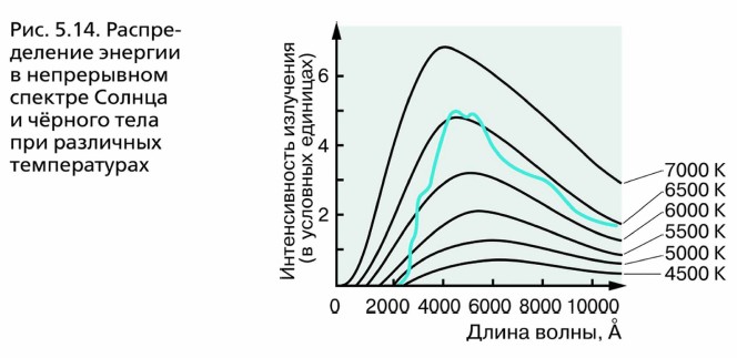 § 22. Расстояния до звёзд. Характеристики излучения звёзд Спектры, цвет и температура звёздВсю информацию о звёздах можно получить только на основе исследования приходящего от них излучения. Наблюдая звёзды, можно заметить, что они имеют различный цвет. Хорошо известно, что цвет любого нагретого тела, в частности звезды, зависит от его температуры. Более полное представление об этой зависимости дает изучение звездных спектров. Для большинства звёзд это спектры поглощения, в которых на фоне непрерывного спектра наблюдаются тёмные линии. Температуру наружных слоев звезды, от которых приходит излучение, определяют по распределению энергии в непрерывном спектре (рис. 5.14), а также по интенсивности разных спектральных линий. Длина волны, на которую приходится максимум излучения, зависит от температуры излучающего тела. По мере увеличения температуры положение максимума смещается от красного к фиолетовому концу спектра. Количественно эта зависимость выражается законом Ви́на: