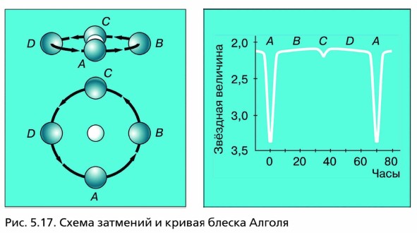 § 23. Массы и размеры звёзд Двойные звёзды. Определение массы звёздДля наблюдателя, который находится в плоскости орбиты спектрально-двойной звезды, ее компоненты будут поочередно загораживать, «затмевать» друг друга. Такие звезды называют затменно-двойными или алголями — по названию наиболее известной звезды этого типа β Персея. Её арабское название «эль гуль» (дьявол) постепенно превратилось в Алголь. Возможно, что ещё древние арабы заметили странное поведение этой звезды: в течение 2 суток 11 часов её яркость остаётся постоянной, но затем за 5 часов она ослабевает от 2,3 до 3,5 звёздной величины, а за следующие 5 часов её прежняя яркость восстанавливается (рис. 5.17).