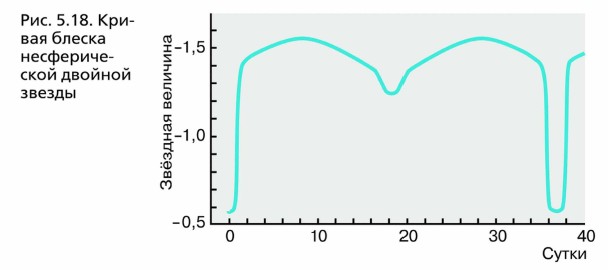 В настоящее время известно более 5 тыс. затменно-двой- ных звёзд. Их изучение позволяет определить не только характеристики орбиты, но также получить некоторые сведения о самих звёздах. Продолжительность затмения даёт возможность судить о размерах звезды. Рекордсменом здесь является s Возничего, в системе которой при периоде 27 лет затмение продолжается 2 года. Когда во время затмения свет одной звезды проходит через атмосферу другой, можно детально исследовать строение и состав этой атмосферы. Форма кривой блеска некоторых звёзд свидетельствует о том, что их форма существенно отличается от сферической (рис. 5.18). Близкое расположение компонентов приводит к тому, что газы из атмосферы одной звезды перетекают на другую. Иногда эти процессы принимают катастрофический характер, и наблюдается вспышка новой звезды.