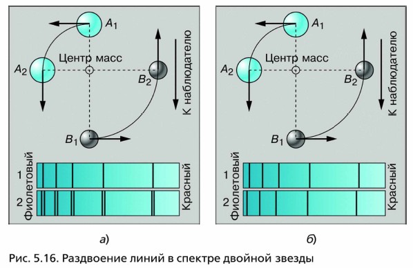Чтобы определить массу каждой звезды, надо изучить движение каждой из них и вычислить их расстояния А1 и А2 (А = А1 + А2) от общего центра масс. Тогда мы получим второе уравнение: m1 : m2 = А2: А1. Решая систему двух уравнений, можно вычислить массу каждой звезды. У спектрально-двойных звёзд наблюдается смещение (или раздвоение) линий в спектре, которое происходит вследствие эффекта Доплера1. Оно меняется с периодом, равным периоду обращения пары. Если яркости и спектры звёзд, составляющих пару, сходны, то в спектре наблюдается периодическое раздвоение линий (рис. 5.16, а). Пусть компоненты A и В занимают положения A2 или В2, когда один движется по направлению к наблюдателю, а другой — от него. Спектральные линии приближающейся звезды сместятся к фиолетовому концу спектра, а удаляющейся — к красному. Линии в спектре будут раздвоены. В положениях A1, и В1 оба компонента движутся перпендикулярно лучу зрения, и раздвоения линий не наблюдается. Если одна из звёзд настолько слаба, что её линии не видны, то будет наблюдаться периодическое смещение линий более яркой звезды (рис. 5.16, б). 1 Напомним, что, согласно этому эффекту, при увеличении расстояния между звездой и наблюдателем длина волны принимаемого излучения увеличивается, поэтому спектральные линии смещаются к красному концу спектра. При уменьшении расстояния длина волны уменьшается, а линии смещаются к фиолетовому концу спектра.