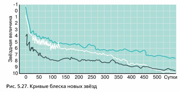 § 24. Переменные и нестационарные звёзды 2. Новые и сверхновые звёздыНачиная с глубокой древности, в исторических летописях разных народов неоднократно отмечены случаи появления звёзд, видимых невооружённым глазом на том месте, где их прежде не было. Особенно удивительными были эти «новые» звёзды, когда они становились столь яркими, что могли наблюдаться даже днём. Затем их свет постепенно, в течение нескольких месяцев ослабевал настолько, что звезду уже нельзя было видеть невооружённым глазом. Например, в китайских и японских хрониках сохранились сведения о «звезде-гостье», которая вспыхнула в созвездии Тельца в 1054 г. и в течение трех недель была видна днем, а через год совершенно «исчезла». В 1572 г. учитель Кеплера Тихо Браге наблюдал в созвездии Кассиопеи новую звезду, которая была ярче Венеры. В 1604 г. уже сам Кеплер наблюдал новую звезду в созвездии Змееносца. В XX в. тщательные наблюдения за звёздным небом с применением фотографии позволили установить, что такие неожиданные вспышки наблюдаются у звёзд, которые до этого долгое время оставались слабыми и не привлекали к себе внимание астрономов. В настоящее время различают новые и сверхновые вспыхивающие звёзды. У новых звёзд светимость возрастает на 12—13 звёздных величин и выделяется энергия до 1039 Дж. Звезда приобретает максимальную яркость всего за несколько суток, а ослабление до первоначального значения светимости может длиться годами (рис. 5.27). Долгое время причины вспышек новых звезд оставались непонятными. Положение изменилось, когда в 1954 г. было обнаружено, что одна из новых звёзд (DQ Геркулеса) является двойной с периодом обращения всего 4 ч 39 мин. Один из компонентов — белый карлик, а другой — красная звезда главной последовательности. Из-за их близкого расположения на белый карлик перетекает газ из атмосферы красного карлика. По мере накопления водорода плотность и температура внешних слоёв белого карлика возрастает, создаются условия для начала термоядерных реакций превращения водорода в гелий. Они происходят настолько быстро, что приобретают характер взрыва. При этом внешние слои звезды, составляющие небольшую часть её массы, расширяются и выбрасываются в космическое пространство. Их свечение и наблюдается как вспышка новой звезды. Такое явление может повторяться с тесными двойными звёздами неоднократно: у одних через тысячи, у других с изменением светимости на 4—5 звёздных величин через несколько десятков лет.