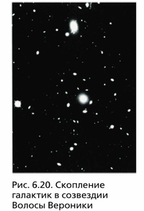 Строение и эволюция Вселенной Другие звёздные системы — галактикиБольшинство галактик группируется в скопления, которые делятся на два типа: правильные и неправильные. Правильные скопления галактик во многом напоминают шаровые звёздные скопления, для которых характерна сферическая симметрия с сильной концентрацией галактик к центру. Типичное скопление такого типа размером около 4 Мпк, которое наблюдается в созвездии Волосы Вероники, насчитывает несколько десятков тысяч галактик (рис. 6.20).
