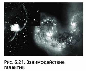 Концентрация галактик в скоплениях бывает так велика, что они располагаются очень близко друг к другу. Их гравитационное взаимодействие вызывает значительное изменение формы галактик. Часто наблюдаются соединяющие их перемычки, которые состоят из звёзд или газа, а также уходящие далеко в сторону протяжённые «хвосты» (рис. 6.21). Первым к исследованию таких галактик, получивших название взаимодействующих, приступил Б. А. Воронцов-Вельяминов.