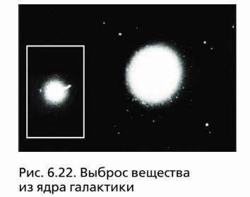 По современным представлениям все крупные галактики возникли не одномоментно, а постепенно увеличивали свою массу за счёт слияния более мелких объектов, которые подразделяют на большие (слияние галактик сопоставимой массы) и малые (массы галактик разнятся в несколько раз и более). Так, например, считается, что галактика NGC 5128 является результатом слияния эллиптической и спиральной галактик. Радионаблюдения обнаружили следы взаимодействия нашей Галактики с ее ближайшими соседями — идущии к ней поток газа от Магеллановых Облаков. Вероятно, через несколько миллиардов лет их звёзды вольются в состав Галактики. Среди взаимодействующих галактик и галактик, имеющих близких спутников, часто наблюдаются галактики с активными ядрами. Ядро любой галактики, её центральная часть, всегда выделяется своей яркостью. Небольшое число галактик (около 1%) имеет особенно яркие ядра, в которых происходит колоссальное выделение энергии. Их активность может проявляться по-разному. Во-первых, это очень большая мощность излучения (светимость) не только в оптической, но и в рентгеновской или инфракрасной части спектра. Светимость ядер таких галактик почти такая же, как светимость всей нашей Галактики. Излучение исходит из области, диаметр которой составляет примерно 1 пк, и заметно меняется порой за несколько месяцев или даже дней. Во-вторых, в ядре происходит движение газа со скоростями тысячи километров в секунду, что приводит к появлению длинных выбросов — джетов (рис. 6.22). В-третьих, мощные потоки электронов и протонов высокой энергии, идущие из ядра в двух противоположных направлениях, порождают синхротронное радиоизлучение.