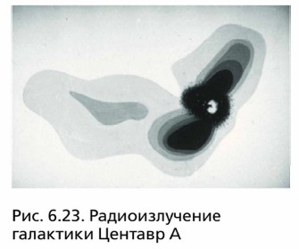 Галактики с активными ядрами, являющиеся источниками радиоизлучения большой мощности, называют радиогалактиками (см. рис. 3 на цветной вклейке XVI). Их радиоизлучение может быть в десятки тысяч раз больше по мощности, чем радиоизлучение нашей Галактики или других, подобных ей. Характерно, что наиболее интенсивное радиоизлучение приходит от областей, которые располагаются примерно симметрично по обе стороны от галактики и значительно превосходят её по размерам (рис. 6.23).