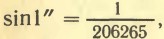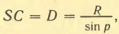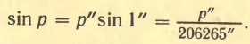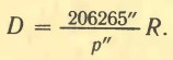 где R — радиус Земли. Приняв R за единицу, можно выразить расстояние до светила в земных радиусах. Параллакс Луны составляет 57'. Все планеты и Солнце гораздо дальше, и их параллаксы составляют секунды. Параллакс Солнца, например, При малых углах sin р ≈ р, если угол р выражен в радианах. Если р выражен в секундах дуги, то вводится множитель Тогда