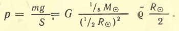 это значение соизмеримо с плотностью воды и в тысячу раз больше плотности воздуха у поверхности Земли. Однако в наружных слоях Солнца плотность в миллионы раз меньше, а в центре — в 100 раз больше, чем Под действием сил гравитационного притяжения, направленных к центру Солнца, в его недрах создается огромное давление. Если бы вещество внутри Солнца было распределено равномерно и плотность всюду равнялась средней, то рассчитать внутреннее давление было бы легко. Сделаем приближенно такой расчет для глубины, равной половине радиуса. Сила тяжести на этой глубине будет определяться только притяжением масс, находящихся внутри сферы радиусом