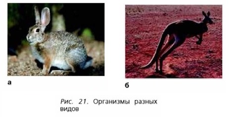 При классификации учитывается не только сходство внешнего и внутреннего строения. Учёные исследуют происхождение видов и устанавливают родство между ними. Одни виды являются близкими родственниками, другие — дальними. Подробно о классификации организмов вы узнаете в 7 классе, а пока познакомитесь с двумя группами (единицами) классификации: царством и видом. Учёные объединили все организмы в четыре царства: Бактерии, Грибы, Растения и Животные. Царства живой природыЦарство — очень большая группа организмов, которые обладают сходными признаками строения и процессов жизнедеятельности, отличаются от других групп способом питания и строением клетки. Например, представители царства Растения характеризуются наличием в их клетках зелёного пигмента (хлорофилла) и способностью создавать органические вещества из неорганических. Почти все они ведут неподвижный образ жизни. Организмы царства Животные отличает огромное многообразие и сложные формы поведения. Животные в отличие от растений питаются готовыми органическими веществами. Они активно отыскивают пищу, убежища от врагов и непогоды, места, благоприятные для размножения. Царство Бактерии включает мельчайшие одноклеточные организмы, невидимые невооружённым глазом. В клетках бактерий нет ядра. Одни бактерии участвуют в круговороте веществ, другие — превращают молоко в простоквашу, третьи — вызывают у людей скарлатипу, холеру и многие другие болезни. Грибы долго относили то к растениям, то к животным. Сейчас их выделяют в особое царство живой природы. Грибы — одна из наиболее разнообразных групп живых организмов. Они питаются готовыми органическими веществами. Мы с вами будем постоянно пользоваться такой единицей классификации организмов, как вид. Вид — это группа организмов (особей), сходных между собой и занимающих общую территорию. Названия видов состоят из двух слов, например берёза бородавчатая и берёза пушистая, заяц русак и заяц беляк. Одни виды широко распространены на Земле, их можно встретить повсюду, например подорожник большой, одуванчик лекарственный, заяц русак (рис. 21, а). Другие виды встречаются редко, только на определённой территории. Например, верблюжья колючка, кобра, серый варан обитают в пустыне, императорский пингвин — в Антарктиде, кенгуру (рис. 21, б) — в Австралии.