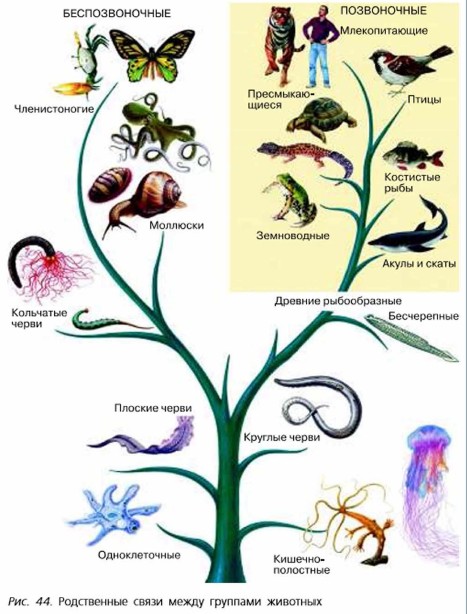 Учёные предполагают, что первые животные возникли в море около 1,5 млрд лет назад. Царство Животные — одна из самых больших групп живых существ на нашей планете. По разнообразию Царство Животные намного превосходит Царство Растения. Известно около 2 млн видов современных животных. Трудно рассчитать, сколько видов животных существовало в предыдущие геологические эпохи. Возможно, что их было во много раз больше, чем современных. Сейчас на Земле обитает множество разнообразных животных. Их количество невозможно подсчитать. Огромные скопления образуют крупные животные: птицы на птичьих базарах, морские котики на лежбищах, косяки рыб в морях. Большие стаи образуют перелётные птицы, саранча. Особенно многочисленны мелкие животные. В 1 м3 воды может содержаться около 77 млн экземпляров мельчайших водных животных, а в 1 м3 почвы — несколько сотен тысяч почвенных животных. Животные отличаются внешним и внутренним строением, размерами, образом жизни. Одни животные покрыты шерстью, другие — перьями, третьи — чешуёй, у четвёртых есть раковины, а у многих вообще нет твёрдых частей тела. Но все животные имеют общие признаки. В качестве источника энергии они используют готовые органические вещества, накопленные другими организмами. Животные питаются бактериями, грибами, растениями, другими животными или их остатками. Такой способ питания готовыми органическими веществами называют гетеротрофным. Рост животных обычно прекращается после определённого периода развития. Многие животные активно передвигаются: ползают, прыгают, бегают, летают, плавают. Но есть среди животных и малоподвижные, ведущие прикреплённый образ жизни, например коралловые полипы. Способность большинства животных к активному передвижению отличает их от других оргапизмов. Все животные, населяющие нашу планету, составляют её животный мир. Современные представления об историческом развитии животного мира и родственных связях между наиболее значимыми группами животных показаны на рисунке 44. В группы животных объединяют на основе данных об их родстве и сходстве.