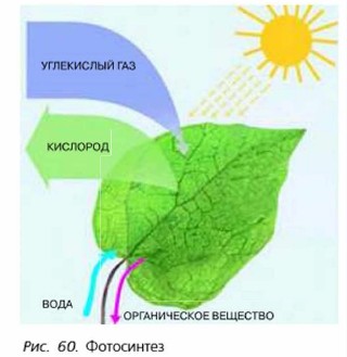 Фотосинтез (рис. 60) происходит только в тех клетках, которые содержат хлоропласты. В хлоропластах имеется зелёный пигмент хлорофилл, который придаёт растению зелёную окраску. Именно он улавливает энергию света, необходимую для образования органических веществ. У растений имеются приспособления для улавливапия света: широкая и плоская листовая пластинка; расположение листьев на стебле так, чтобы они не затеняли друг друга; прозрачпая кожица, через которую, как через стекло, свет проникает внутрь листа. Углекислый газ, необходимый для фотосинтеза, растение поглощает из воздуха. Часто в растениях образуется больше органических веществ, чем может быть немедленно израсходовано для роста и других жизненных процессов. Часть органических веществ запасается в семенах, клубнях, луковицах. Наиболее важным и часто запасаемым растениями веществом является крахмал. Какова же роль фотосинтеза в природе и жизни человека?Созданные в процессе фотосинтеза органические вещества — источник пищи и энергии для всего живого па Земле. За миллиарды лет на нашей планете накопились большие запасы органических веществ в виде каменного угля и торфа. Всё это бывшие растения, в которых запасена преобразованная солнечная энергия.