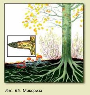 Вы уже знаете, что некоторые азотфиксирующие бактерии могут поселяться в корнях бобовых растений (см. рис. 24). Эти бактерии образуют соединения азота, которые используют растения. От растений бактерии получают углеводы и минеральные соли. Таким образом, между бобовыми растениями и клубеньковыми бактериями существует тесная связь, полезная как одному, так и другому организму — симбиоз. Примером симбиоза также являются лишайники (см. § 15). Симбиотические отношения широко распространены между грибами и растениями. Грибники знают, что подберёзовики чаще всего можно встретит!» в березняке, белые грибы — вблизи берёз, сосен, елей и дубов, рыжики — в сосновых и еловых лесах, подосиновики — в осинниках. Это объясняется тем, что между определёнными видами растений и грибов устанавливается тесная связь, полезная как одному, так и другому организму, то есть симбиоз. Нити грибницы плотно оплетают корень растения и даже проникают внутрь его, образуя грибокорень, или микоризу (рис. 65). Грибница поглощает из почвы воду и растворённые минеральные вещества, которые поступают из неё в корпи растений. В свою очередь, грибница получает органические вещества, необходимые ей для питания и образования плодовых тел, из корней растений.