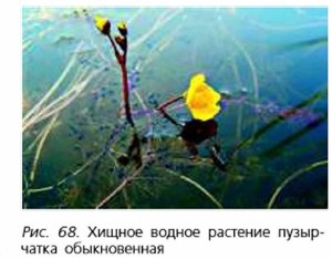 Плотоядные животные, или хищники, питаются другими животными (рис. 66, б). Например, основной пищей хищника рыси служат зайцы. Обычно хищник вначале убивает свою добычу (жертву), а затем поедает её. Но прежде он должен жертву поймать. Для этого у хищника есть специальные приспособления: острые когти, зубы и т. д. Однако и у жертв исторически вырабатываются защитные особенности: шипы, панцири, защитная окраска, ядовитые железы, способность быстро прятаться, зарываться в рыхлый грунт, строить недоступные хищникам убежища. До недавнего времени считалось, что все хищники — вредные животные. Это представление ошибочно. Уничтожение хищников часто приводит к нежелательным последствиям и наносит большой ущерб и природе, и человеку. Жертвами хищников обычно становятся больные и ослабленные животные. Уничтожение хищниками таких животных сдерживает распрострапепие болезней. Всеядные животные питаются как растительной, так и животной пищей, а также останками погибших животных (рис. бб, в). Всеядным является, например, бурый медведь. Этот могучий зверь питается преимущественно ягодами, орехами, зелёными частями растений, а также насекомыми и их личинками, рыбой, падалью. Охотится бурый медведь и на крупных животных — лосей, кабанов. Съеденную пищу животные переваривают и усваивают. Усвоенная часть пищи расходуется на прирост собственной массы и жизнедеятельность организма, например для дыхания, сопровождающегося выделением тепла. При дыхании питательные вещества взаимодействуют с кислородом и превращаются в углекислый газ и воду. Непереваренные остатки пищи удаляются из организмов животных. Отметим, что гетеротрофное питание присуще и некоторым хищным растениям. Многие из них способны захватывать мелких животных видоизменёнными листьями. Наиболее известны насекомоядные растения с листьями-ловушками, листьями-липучками и листьями-кувшинчиками (рис. 67). Двустворчатые листья-ловушки с зубцами есть у растения венерина мухоловка (рис. 67, б). Как только насекомое прикоснётся к чувствительным волоскам листа, его створки стремительно захлопываются. Зубцы по краям створок листа смыкаются, и выход жертве закрыт. Чем отчаянней бьётся добыча в западне, тем крепче сжимаются створки листа. Они всё сильнее прилегают одна к другой и сдавливают добычу. Верхняя поверхность листа усеяна мелкими красными желёзками. Они выделяют жидкость с пищеварительными веществами. Жертва переваривается и служит источником дополнительного питания для венериной мухоловки.