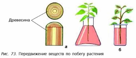 Моя лаборатория Передвижение веществ у растенийЛабораторная работа Опыт 1. Срезали побег липы и поместили его в воду, подкрашенную чернилами (рис. 73, а). Через четыре дня сделали поперечный срез стебля. На срезе хорошо были видны окрашенные волокна — древесина, в которой находятся сосуды. Сделайте вывод о передвижении воды с растворёнными в ней минеральными веществами по растению. Если в подкрашенную воду поместить веточку комнатного растения бальзамина, то можно увидеть, как вода поднимается по стеблю в листья, окрашивая их жилки (рис. 73, б).