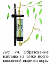 Опыт 2. Вырежьте кольцо с верхнего слоя коры древесной ветки. Поставьте ветку в воду. Через некоторое время над вырезом образуется наплыв. Это скопление органических веществ, которые не могут переместиться вниз через срезанное кольцо коры. Из наплыва развиваются придаточные корни (рис. 74). О чём свидетельствует данный опыт? Сделайте вывод.