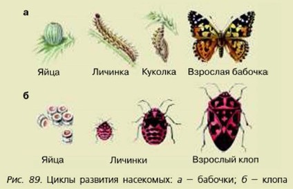 Сложные циклы развития имеют насекомые. Прежде чем превратиться во взрослых особей, они проходят несколько стадий. Например, перестройкой всего организма сопровождается развитие бабочки. Из отложенного бабочкой яйца выходит личинка (гусеница). Она не похожа на взрослое насекомое. Личинка питается и растёт. Достигнув определённых размеров, личинка превращается в куколку. В неподвижной куколке происходят сложные процессы перестройки личиночных органов в органы взрослой бабочки (рис. 89, а).