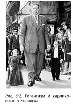 Гормоны роста могут усиливать или замедлять рост и деление клеток, закладку и развитие почек, образование и рост новых корней. Кроме этого, у растений вырабатываются гормоны, регулирующие цветение, образование плодов, покой почек и семян, увядание листьев и другие процессы жизнедеятельности. У животных под контролем гормонов протекают основные этапы развития организма с момента его зарождения до глубокой старости. Например, у насекомых гормоны регулируют рост, линьку и окукливание гусениц, половое размножение и другие процессы. У человека, зверей и птиц биологически активные вещества вырабатываются в специальных органах — железах внутренней секреции (эндокринных), которые тесно взаимосвязаны и образуют эндокринную систему. Избыточное содержание гормона в крови приводит к уменьшению его выделения. Недостаток, наоборот, стимулирует выделение гормона. Гормоны влияют на работу органов. Например, при повышении содержания адреналина в крови усиливается работа сердца, сужаются кровеносные сосуды, повышается температура тела и уровень глюкозы в крови. Недостаточное или избыточное выделение гормонов у человека может привести к эндокринным заболеваниям (рис. 92). С нарушением гормональной регуляции во многом связаны процессы старения, развития сердечпо-сосудистых и ряда других заболеваний. Новые понятия Гормоны. Гормональная регуляция. Гуморальная регуляция Ответьте на вопросы 1. Какова роль гормонов в жизнедеятельности организмов? 2. Почему организмы высокоорганизованных животных (зверей и птиц) функционируют как единое целое? 3. Что такое гуморальная регуляция? ПОДУМАЙТЕ! К чему может привести нарушение гуморальной регуляции организма?