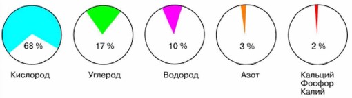 Клетки всех живых организмов состоят из одних и тех же химических элементов. Эти же элементы входят и в состав объектов неживой природы. Сходство состава указывает на общность живой и неживой природы. В клетках больше всего содержится таких химических элементов, как углерод, водород, кислород и азот. Вместе они составляют до 98% массы клетки. Около 2% массы клетки приходится на следующие восемь элементов: калий, натрий, кальций, хлор, магний, железо, фосфор и серу. Остальные химические элементы содержатся в клетках в очень малых количествах. Примерное соотношение химических элементов в клетке показано на схеме: