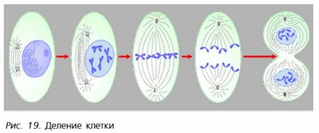 Процессы жизнедеятельности в клеткеЖивые клетки дышат, питаются, растут и размножаются. Вещества, необходимые для жизнедеятельности клеток, поступают в них сквозь клеточную мембрану в виде растворов из внешней среды и других клеток. Причём мембрана хорошо пропускает в клетку одни вещества (например, воду) и задерживает другие. В любой живой клетке постоянно осуществляются сложные и многообразные реакции, необходимые для её жизнедеятельности. Если их ход нарушается, то это может привести к серьёзным изменениям жизнедеятельности клеток и даже к их гибели. Так, получаемые извне органические и минеральные вещества используются клетками для образования необходимых им веществ и построения клеточных структур. При распаде органических веществ выделяется энергия, необходимая для жизнедеятельности клетки. В многоклеточных организмах цитоплазма одной клетки обычно не изолирована от цитоплазмы других клеток, расположенных рядом. Нити цитоплазмы соединяют соседние клетки, проходя через мембрану и поры в клеточных оболочках. Цитоплазма постоянно перемещается внутри клетки. Это заметно по движению органоидов. Движение цитоплазмы способствует перемещению в клетках питательных веществ и воздуха. Чем активнее жизнедеятельность клетки, тем больше скорость движения цитоплазмы. РаздражимостьДля клеток характерно такое свойство всех живых организмов, как раздражимость, то есть они реагируют на внешние и внутренние воздействия. Одноклеточные организмы, реагируя на условия среды, могут изменять свою форму, двигаться в сторону пищи или, наоборот, покидать места, где условия неблагоприятны. Наблюдать влияние температуры на интенсивность движения цитоплазмы можпо па микропрепаратах растительных клеток, например клеток листьев элодеи. Установлено, что наиболее интенсивным движение цитоплазмы, как правило, бывает при температуре 37 °С, но уже при температуре выше 40—42 °С оно прекращается. Деление клетокВ основе всех форм размножения лежит деление клетки (рис. 19). В результате деления клеток организмы не только размножаются, но и растут.