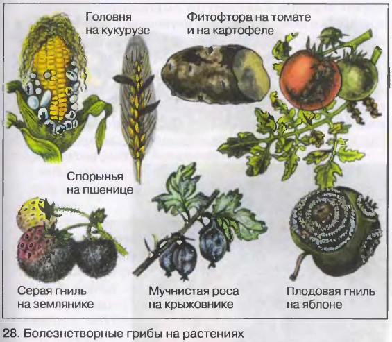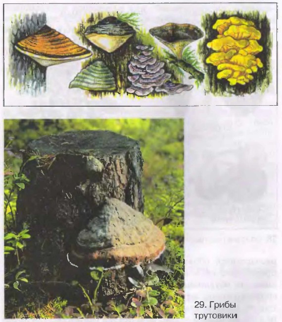 ГоловняРазные виды этого гриба могут поражать хлебные злаки: пшеницу, овес, ячмень, просо, кукурузу - Чаще всего споры головни попадают на здоровые зерновки во время уборки урожая и молотьбы и сохраняются на них до посева. Вместе с зерном споры попадают в землю и прорастают в нити грибницы. Грибница проникает в проростки зерновых растений и растет внутри стебля, питаясь его соками. Ко времени цветения злаков грибница головневого гриба достигает колоса. Здесь она сильно разрастается, образует массу спор, разрушает зерновки и превращает их в черную пыпь. Колоски становятся похожи на обуглившиеся головешки. Чтобы уничтожить споры головни, зерно перед посевом необходимо обрабатывать специальными препаратами. Головня может поражать не только злаки, но и другие растения. СпорыньяНа некоторых зерновых культурах поселяется гриб спорынья. У пораженных растений здоровые зерновки превращаются в ядовитые черно-фиолетовые рожки, плотные сплетения нитей грибницы спорыньи. Попав с мукой в пищу, они могут вызвать тяжелое отравление. Грибы трутовикиЭти грибы разрушают древесину деревьев, нанося большой вред лесному хозяйству, садам и паркам [29]. Их споры проникают в дерево через раны, появляющиеся в коре при поломке ветвей, морозобоинах, солнечных ожогах и других повреждениях. Споры прорастают в грибницу, которая распространяется по древесине, разрушает ее, делает трухлявой.