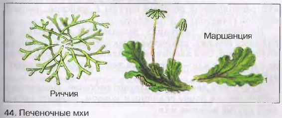 Царство Растения § 14. Мхи1. Что такое ризоиды? 2. Почему водоросли относят к низшим растениям7 3. Что такое спора? Мхи распространены преимущественно в хорошо увлажненных местах и лишь изредка в засушливых областях (в сухой период они находятся в состоянии покоя и возобновляют жизнедеятельность при выпадении осадков). В отличие от водорослей мхи имеют стебель и листья, за исключением ряда видов примитивных печеночных мхов, у которых тело представлено слоевищем. Настоящих корней у мхов нет, их заменяют ризоиды, которыми они укрепляются в почве и всасывают воду. Так как тело мхов расчленено на стебель и листья, а размножаются они спорами, то их относят к высшим споровым растениям. Различают печеночные и листостебельные мхи. Печеночные мхиТе, у кого дома есть аквариум, хорошо знают плавающее растение, зеленым ковром покрывающее поверхность воды. Это один из печеночных мхов — риччия [44]. Тело ее состоит из вильчато разветвленного слоевища. При хорошем освещении риччия быстро разрастается, образуя плотные подушки на поверхности воды.