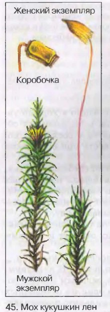 Один из самых известных листостебельных зеленых мхов — кукушкин лен, его часто можно встретить в заболоченных или просто во влажных местах. Его стройные коричневатые стебельки покрыты маленькими темно-зелеными листиками и похожи на миниатюрные растения льна [45]. У кукушкина льна есть мужские и женские растения. На верхушках мужских растений размещаются половые органы, в которых развиваются подвижные половые клетки (гаметы) — сперматозоиды (от греческих слов «сперма» — семя, «зоон» — живое существо и «эйдос» — вид). У женских растений на верхушках расположены половые органы с женской половой клеткой (гаметой) — яйцеклеткой. На женских растениях развиваются коробочки на длинных ножках, покрытые волосистыми заостренными колпачками. Они напоминают сидящую кукушку. Отсюда и название мха — кукушкин лен. В коробочках развиваются споры. Кукушкин лен — многолетнее растение. Покрывая в сырых местах почву сплошным ковром, он часто вытесняет другие зеленые мхи. Лабораторные работы Строение мха 1. Рассмотрите растение мха. Определите особенности его внешнего строения, найдите стебель и листья. 2. Определите форму, расположение, размер и окраску листьев. Рассмотрите лист под микроскопом и зарисуйте его. 3. Определите, ветвистый или неветвистый стебель у растения. 4. Рассмотрите верхушки стебля, найдите мужские и женские растения. 5. Рассмотрите коробочку со спорами. Каково значение спор в жизни мхов? 6. Сравните строение мха со строением водоросли. В чем их сходство и различие? 7. Запишите свои ответы на вопросы. |