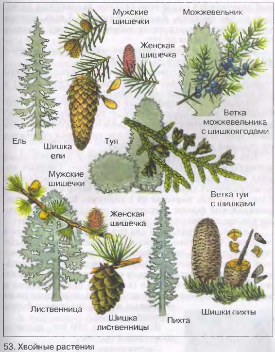 Ель хорошо растет только на богатой питательными веществами, хорошо увлажненной почве. Главный корень у ели развит слабо. Боковые корни располагаются в поверхностных слоях почвы, поэтому ветер иногда валит еловые деревья, вырывая их с корнями. Крона у ели пирамидальной формы. Короткие и остроконечные хвоинки ели сидят поодиночке, оставаясь на ветвях 5—7 лет. У ели тоже образуются два типа шишек — мужские и женские. Фиолетово-красные или зеленоватые молодые женские шишки, появляющиеся на концах прошлогодних побегов, торчат вертикально. Зрелые шишки свисают вниз, созревают они поздно осенью в первый год жизни [54]. После высеивания семян они опадают. Семя у ели крылатое. Мужские шишки, расположенные ниже женских, имеют желтовато-бурую окраску. Живет ель до 250 лет, достигая 40-метровой высоты. ЛиственницаЛиственница [53] широко распространена в нашей стране, особенно в Сибири. Это очень светолюбивая и холодостойкая порода. Она может расти на сухих песках, каменистых и заболоченных почвах. Хвоинки лиственницы светло-зеленые, мягкие, не имеющие плотной кожицы, иреди хвойных деревьев нашей страны только лиственница ежегодно сбрасывает хвою. Живет она до 400—500 лет, достигая 30 м в высоту и 2 м в диаметре. МожжевельникМожжевельник [53] — небольшое деревце или кустарник. Растет в еловых и сосновых лесах. Листья игольчатые. Чешуйки женских шишек мясистые, сочные, срастаются вместе, образуя шишкоягоду, созревающую два года. Можжевельник растет медленно, но очень долговечен, живет до 2 тыс. лет. В настоящее время он стал редкостью в наших лесах и нуждается в охране.