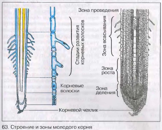 Клетки корневого чехлика защищают верхушку корня от повреждений твердыми частицами почвы. Эти клетки недолговечны, они постепенно отмирают и слущиваются, а взамен отмерших постоянно образуются новые. Корневой чехлик образован клетками покровной ткани. Он защищает участок, образованный мелкими, плотно прилегающими одна к другой живыми клетками. Это образовательная ткань. Клетки здесь постоянно делятся, число их увеличивается, поэтому этот участок называют зоной деления. Выше расположена зона растяжения; здесь клетки вытягиваются, в результате чего корень растет в длину [64]. Корневые волоски. Зона всасывания