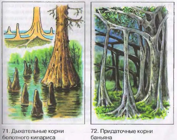 Строение и многообразие покрытосеменных растений § 21. Условия произрастания и видоизменения корней (окончание)У плюща развиваются придаточные корни-прицепки, ими растение прикрепляется к опоре, например к вертикальной стене или к стволу дерева, и благодаря этому растет вверх, вынося листья к свету. У растений, живущих, как орхидеи, на стволах и ветвях деревьев влажных тропических лесов, образуются воздушные корни, свободно свисающие вниз [70]. Такие корни поглощают дождевую воду и помогают растениям жить в этих своеобразных условиях. Дыхательные корни образуются у ивы ломкой или у некоторых других растений, если они поселяются на топких берегах рек [71]. Эти корни растут вертикально вверх, пока не достигнут поверхности почвы. По межклетникам воздух перемещается в корни, находящиеся глубже, в условиях недостатка кислорода.