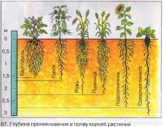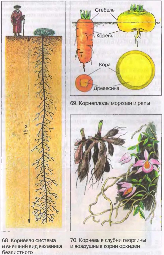 Из-за вечной мерзлоты в тундре корни растений расположены у поверхности, а сами растения низкорослые. Так, у карликовой березы корни проникают почву на глубину не более 20 см. Растения пустынь имеют очень длинные корни, так как грунтовые воды расположены глубоко. У ежовника безлистного, например, корни уходят в почву на 15 м [68]. В процессе приспособления к условиям существования корни у некоторых видов растений видоизменились и стали выполнять дополнительные функции. Редис, турнепс, свекла, репа, брюква и другие растения запасают питательные вещества в корнеплодах [69]. В образовании корнеплодов принимают участие как главный корень, так и нижние участки стебля.